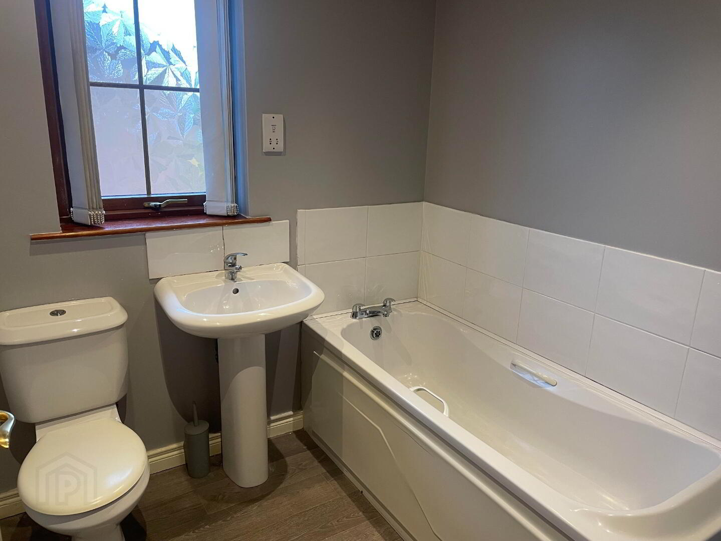 Three piece suite to include WC, Wash hand basin and Bath. Tiled area surrounding bath and at sink. Vinyl flooring, extractor fan and single radiator.