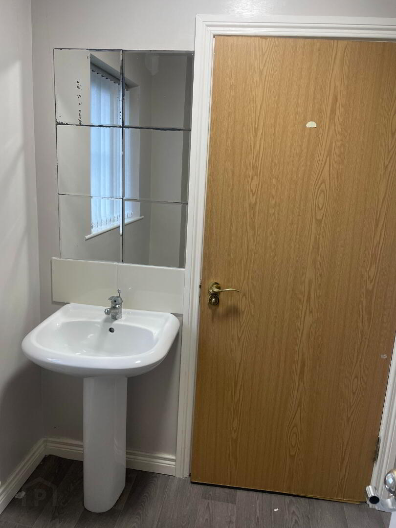 Two piece white suite to include WC and Wash hand basin with tiled splash back. Extractor fan, vinyl flooring, single radiator and heating control panel.