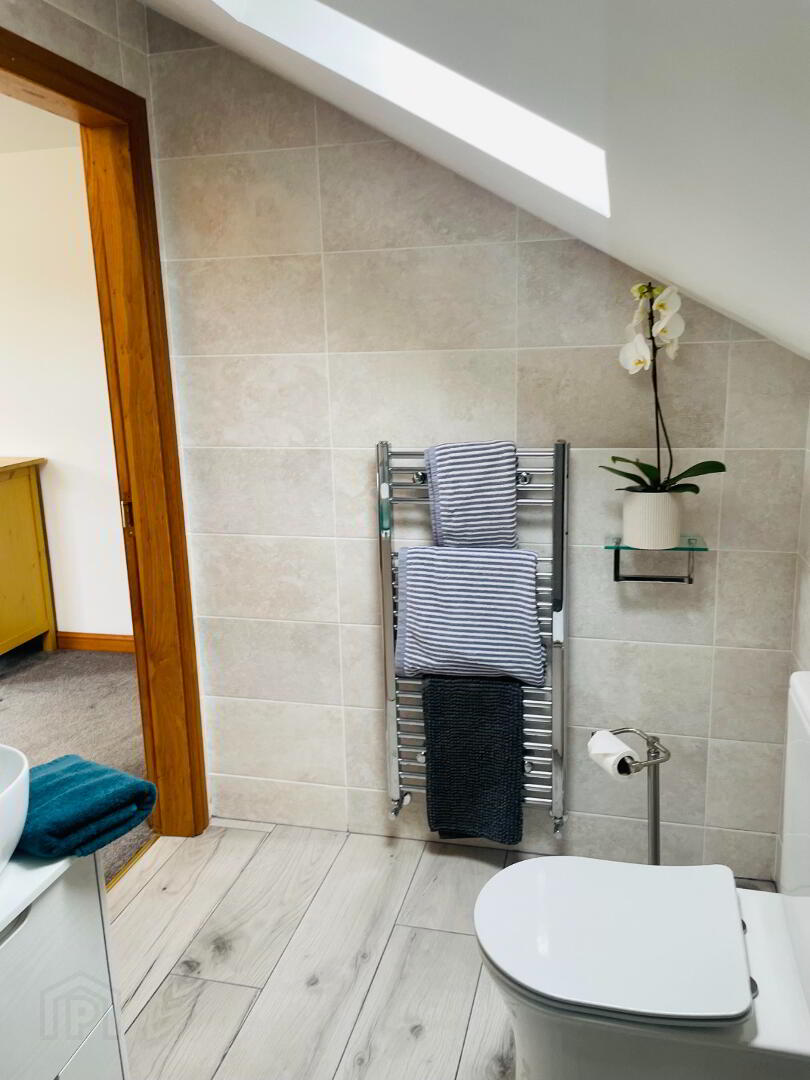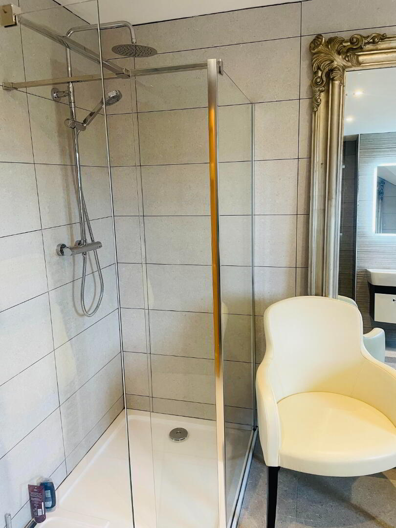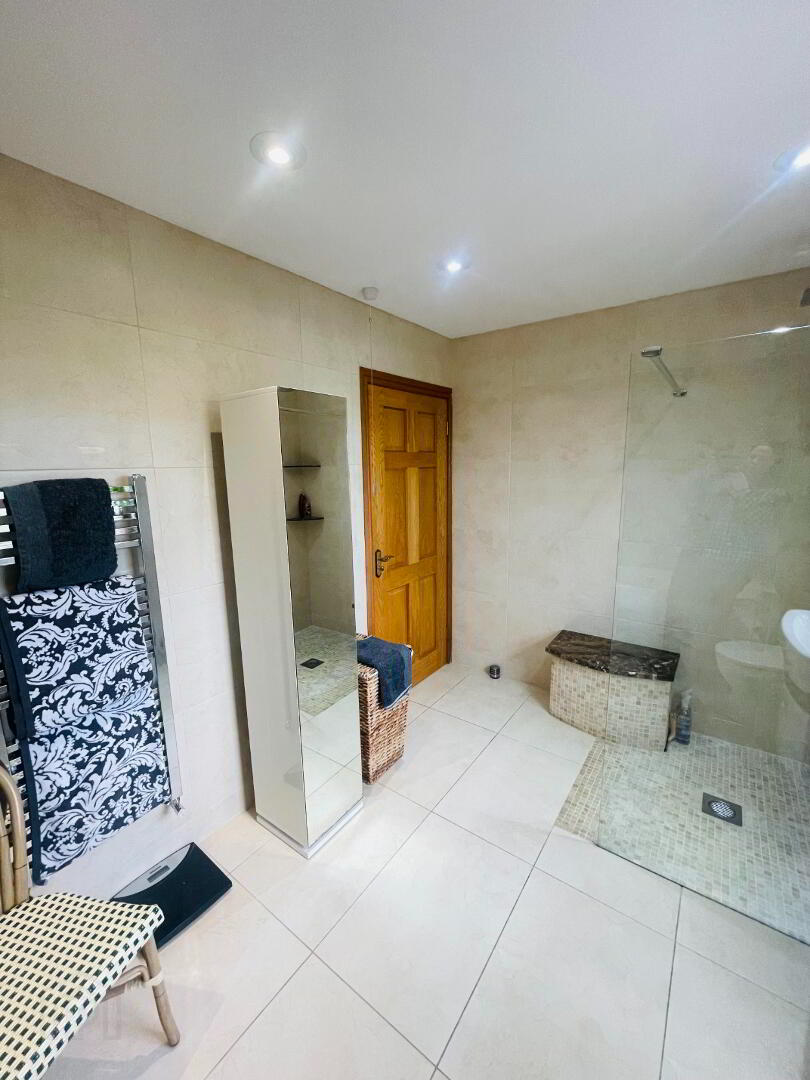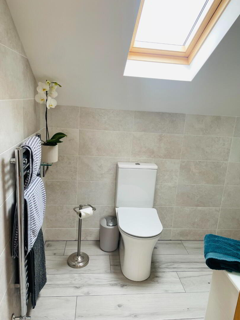 This elegant chic, retreat like Bathroom comes complete with fully tiled flooring and walls, Double walk in shower with Rainfall head and separate shower head, Dual flush WC and Wash hand basin with vanity drawers under. Free standing bath with Mixer taps and shower head hose. The view out this window offers charming countryside views. Large grey radiator and chrome towel radiator. Spotlighting, heated LED Mirror, Extractor fan.
