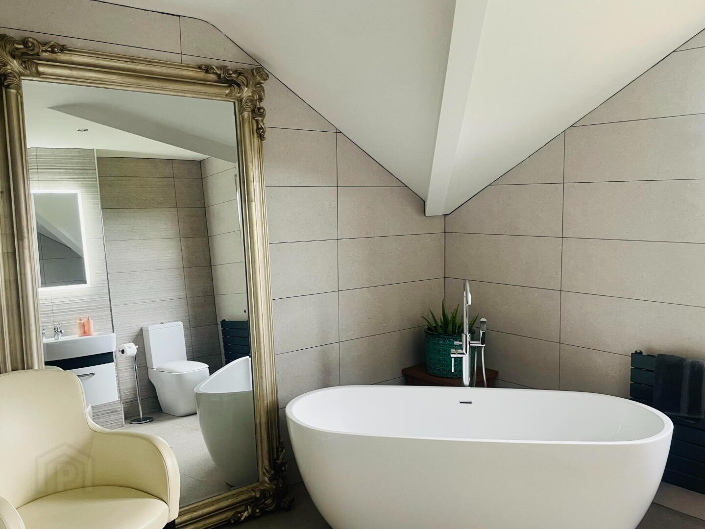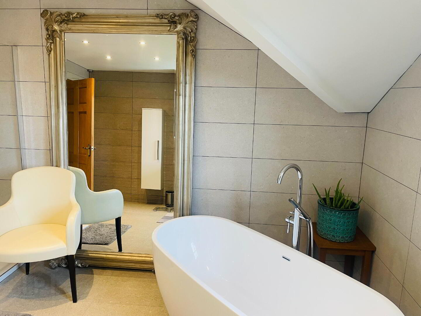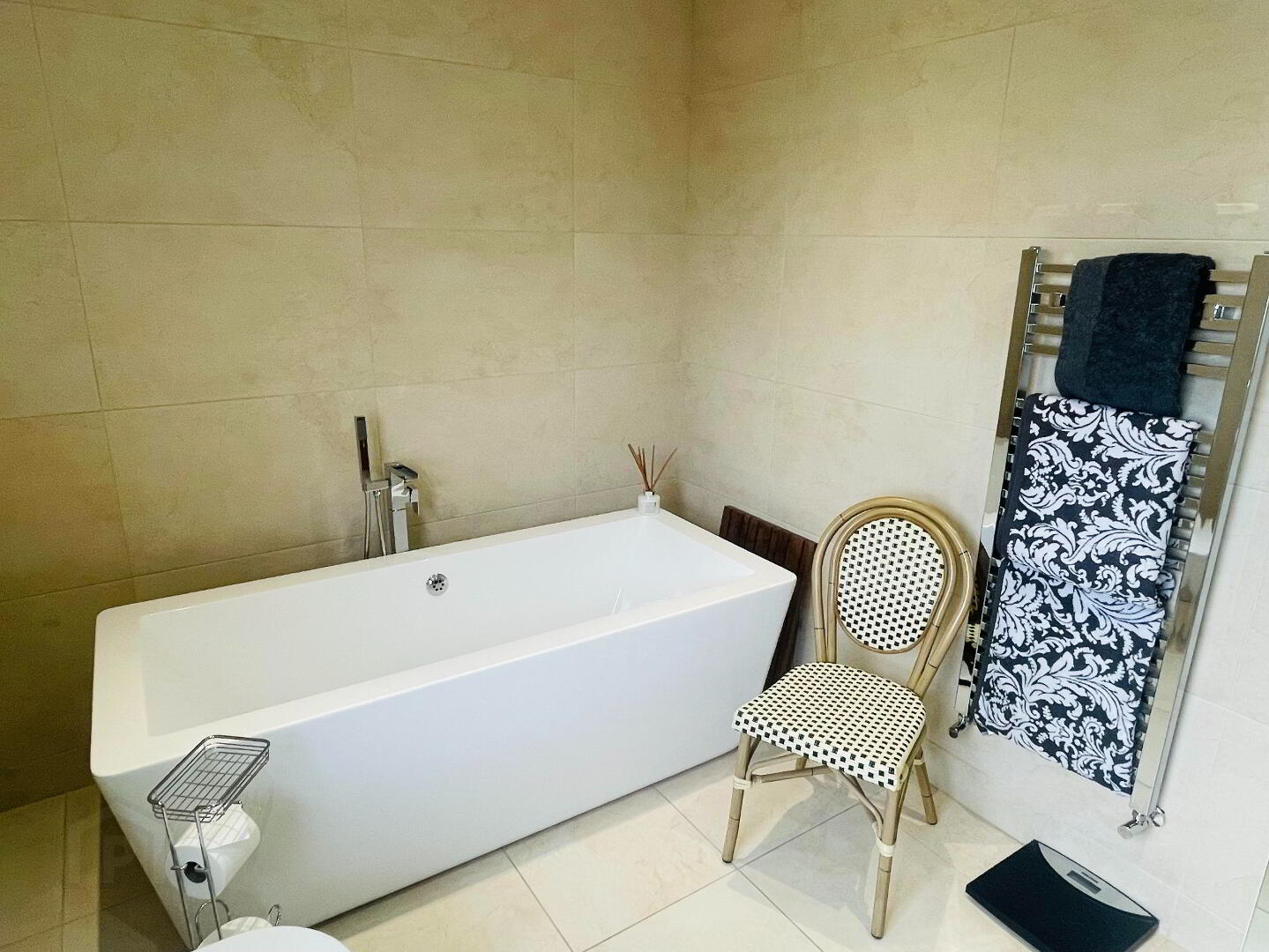 Luxury Bathroom complete with a Four Piece suite, Walk in shower with Rainfall shower head and smaller shower hose, Dual flush WC, Wash hand basin with vanity drawers under. Freestanding large bath to melt away the stresses in life with Waterfall taps and separate shower head. Underfloor heating with Thermostat control, Elegant tiling to the floors and walls. Shaver point, extractor fan, spot lighting and Chrome Towel radiator.