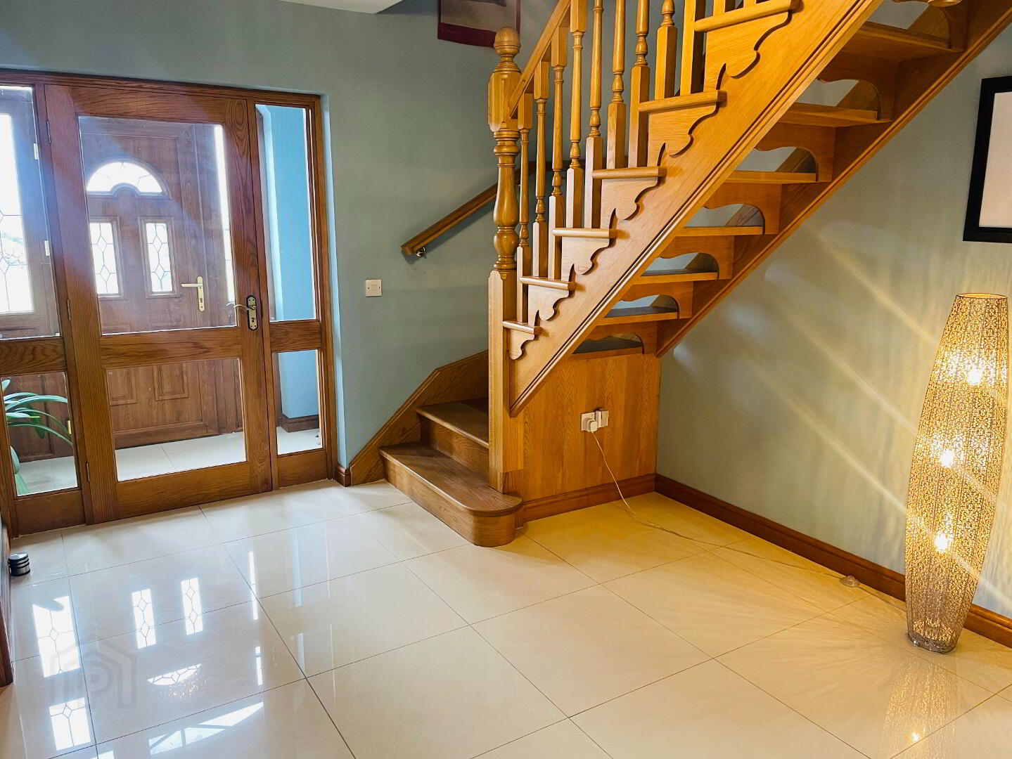 Inviting hallway with porcelain tiled flooring with underfloor heating. Thermostat control. Well crafted Solid Oak Staircase with electrical sockets under.