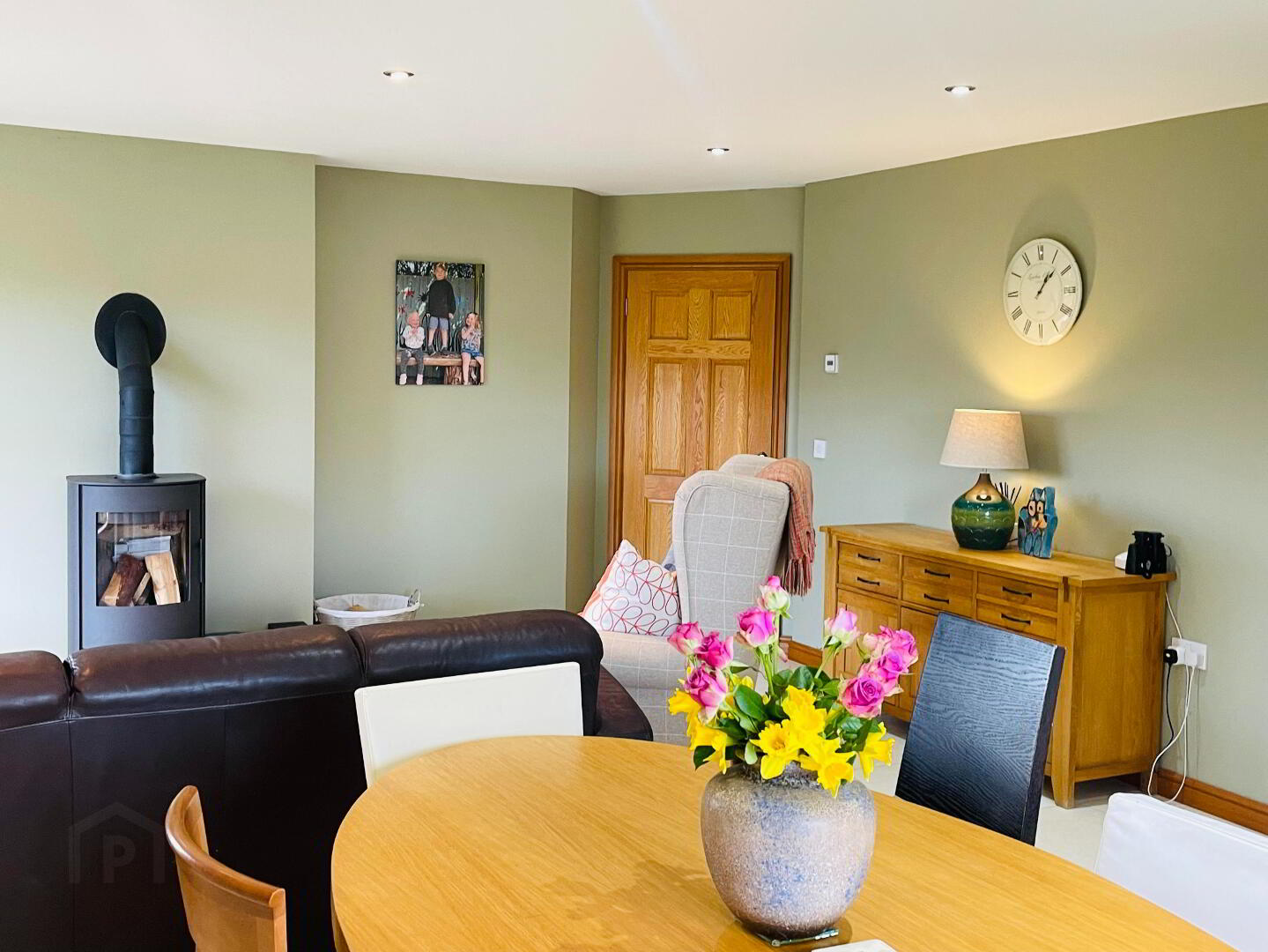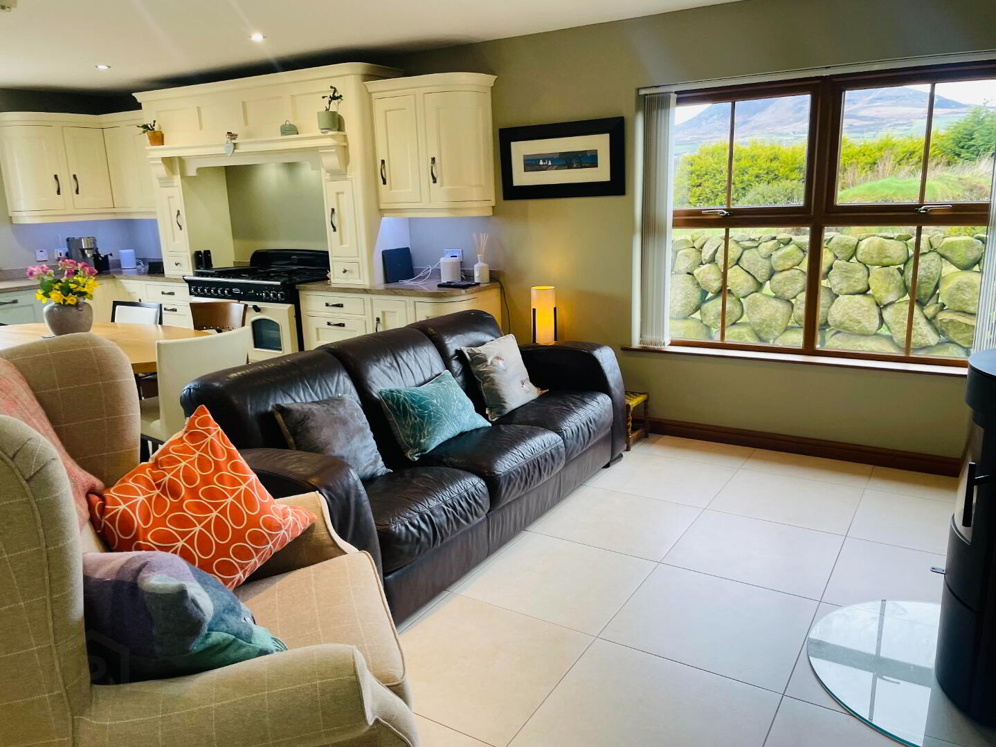 Reception Area: Continuing on from the Kitchen, 'Romotop Laredo' Wood Burning Stove on Glass panel, Tiled flooring with underfloor heating, Thermostat control. Spotlights. Views into the Mourne Mountains.