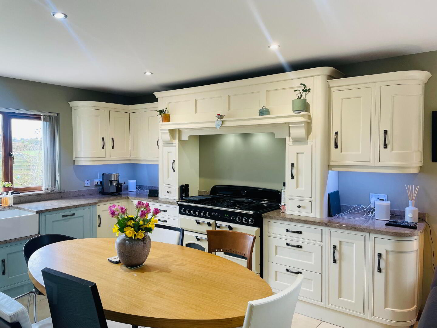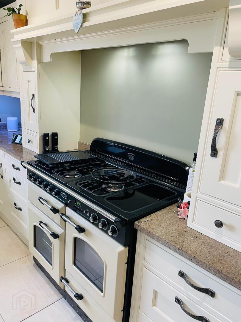 'The Heart of the Home' with large open plan space, with Stunning High and Low 'Shaker' style Bespoke Kitchen completed in a Cream and Duck Egg Blue finish with Granite work top. This would be every home Bakers dream, with a Rangemaster oven, Gas Hob with rings, hot plate and large Wok ring. Rangemaster 'Belfast Sink', Integrated Bosch Dishwasher, recycling drawer. Larder style cupboard. Beautifully pointed tiled flooring complete with underfloor heating. Spotlighting. USB Plug sockets.