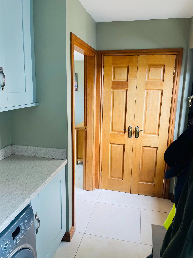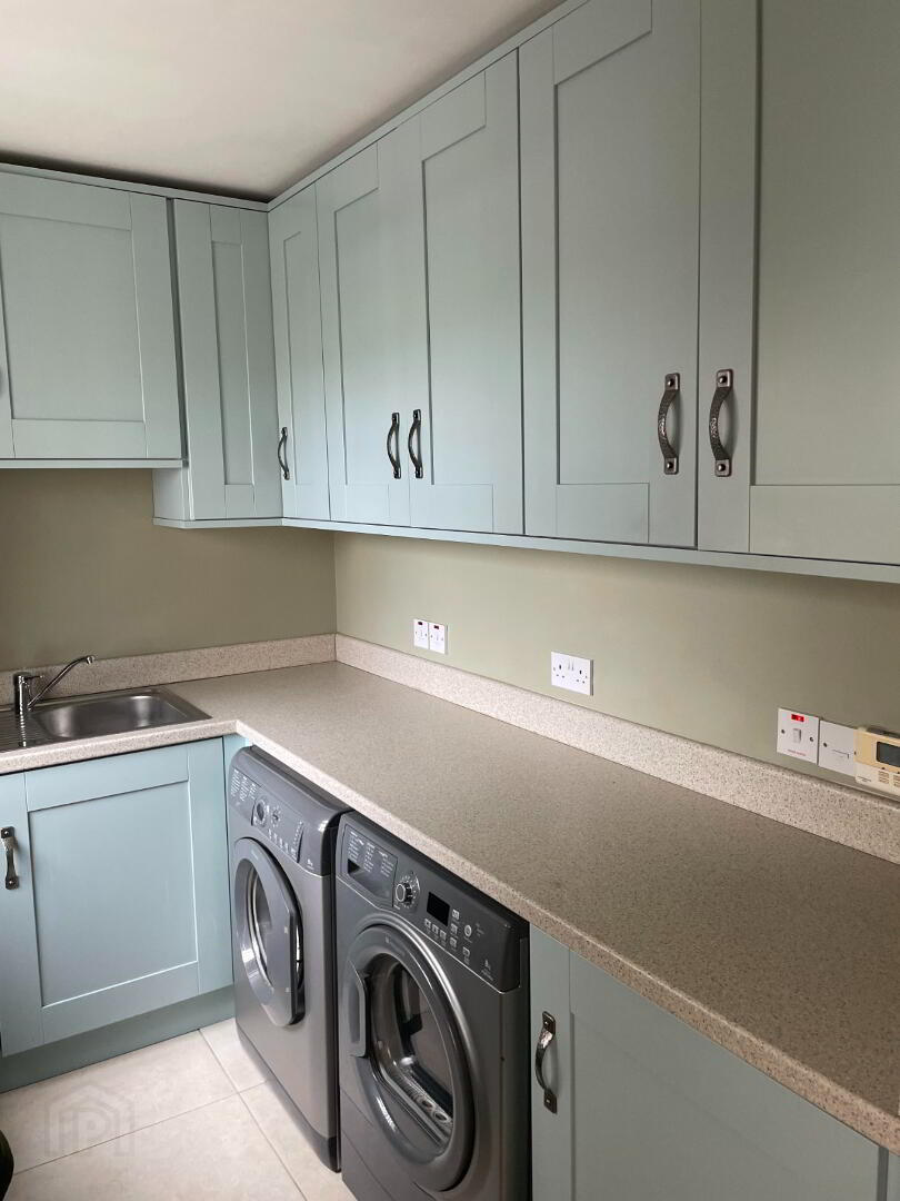 Leading off the Kitchen, with Rear Black PVC Half door, Charming High and Low fitted Duck Egg Blue units incorporating worktop that blends off the Kitchen. Plumbing for washing machine and tumble dryer. Stainless Steel sink and side drainer, heating control panel. The under floor heating can also be controlled by the 'Uponor Smatrix Pule' App from your phone. Off Side built in double cupboard that houses electrics.