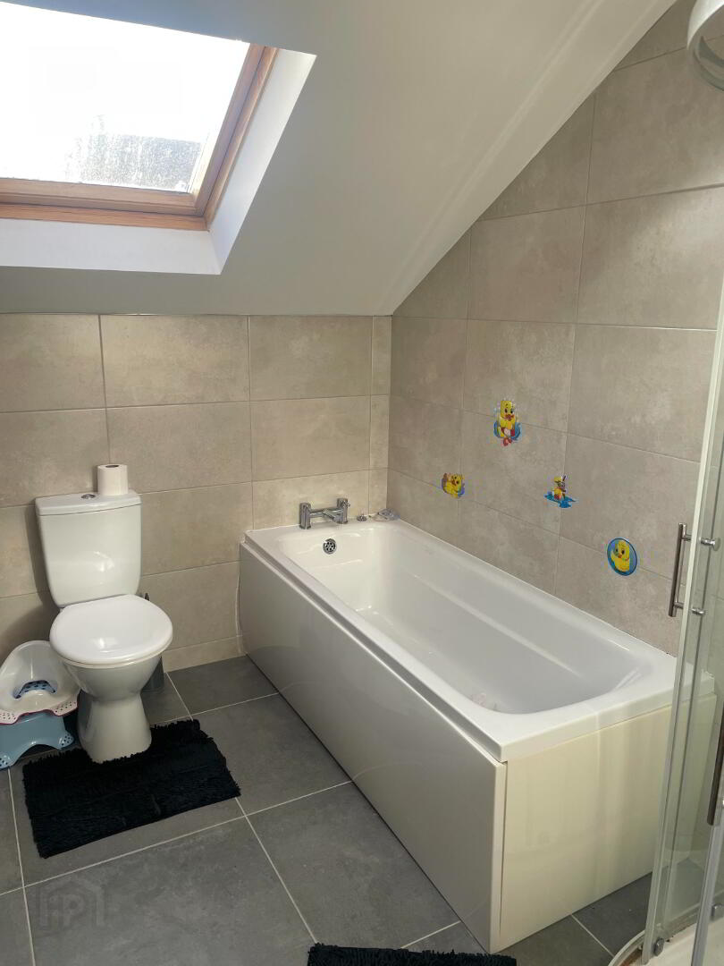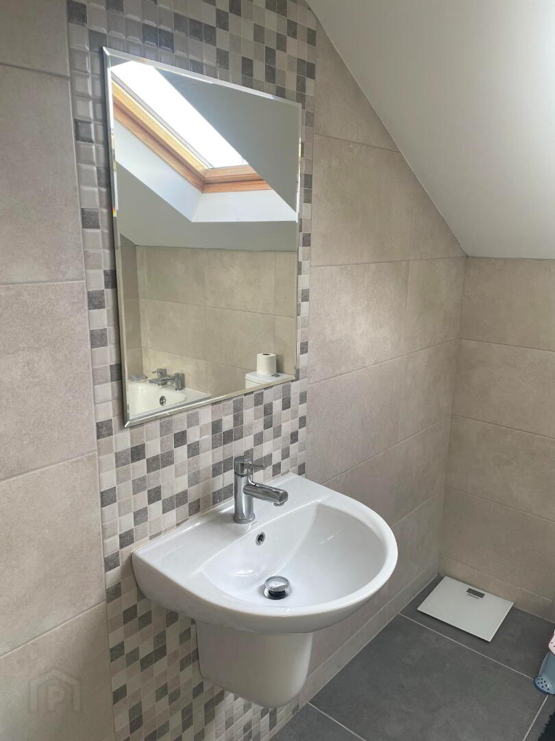 Four piece suite to include WC, Wash Hand Basin, Corner Shower and Bath. Fully tiled flooring and walls. Single Radiator, Large Velux window with rear view aspect.