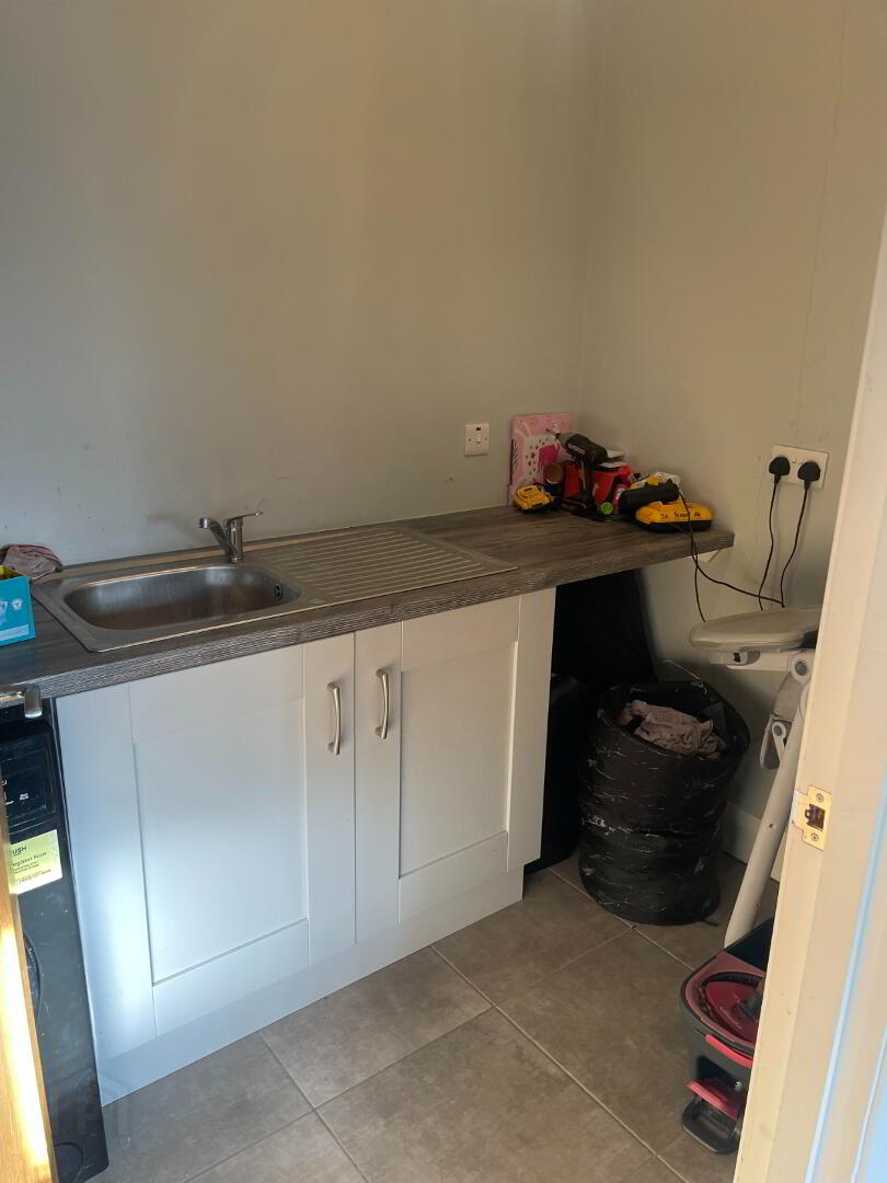 Grey Low fitted units with plumbing for Washing machine, Stainless Steel Sink and side drainer.  Tiled flooring and Single radiator.
