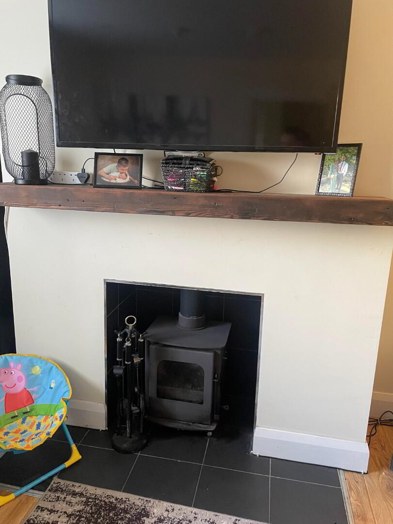 Laminated Wooden flooring, open fireplace with Wood Burning Stove with Black tiled surrounding the inset and tiled hearth, Solid Oak Beam over. Spotlighting, Double radiator.