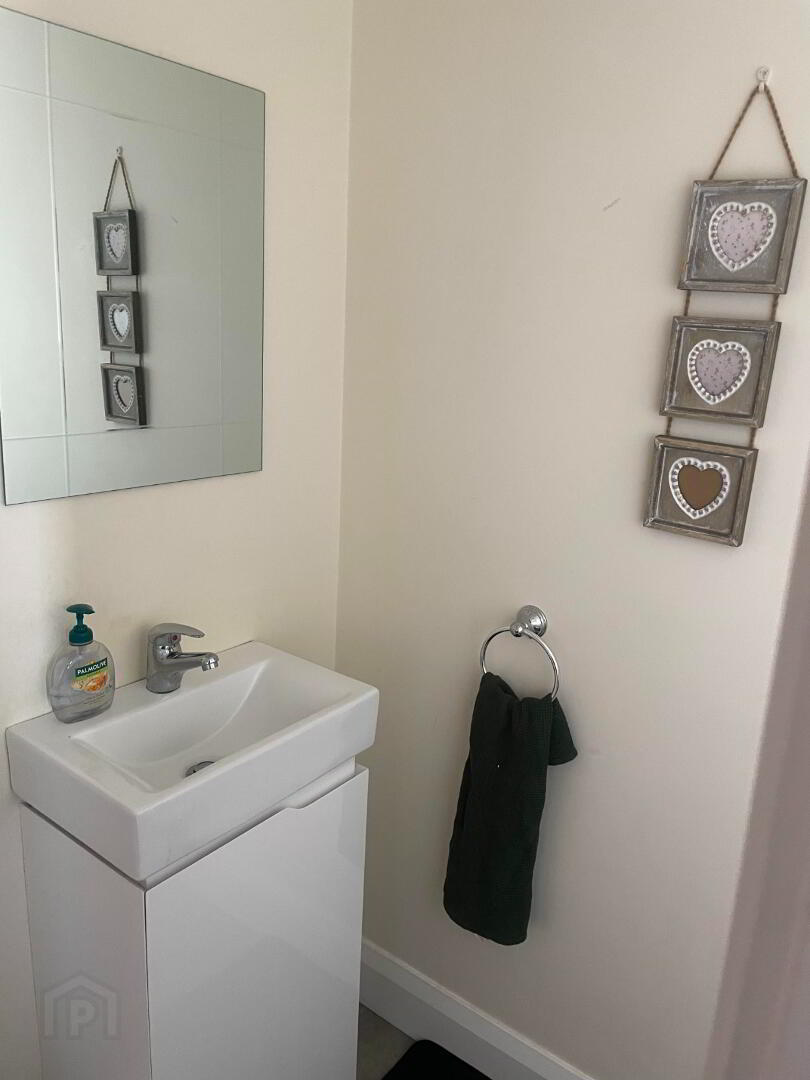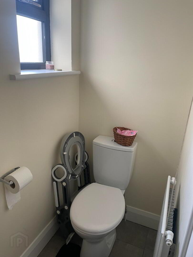 Two piece white suite to include WC and Wash hand basin, side privacy window, Tiled flooring, extractor fan and single radiator.