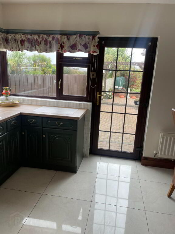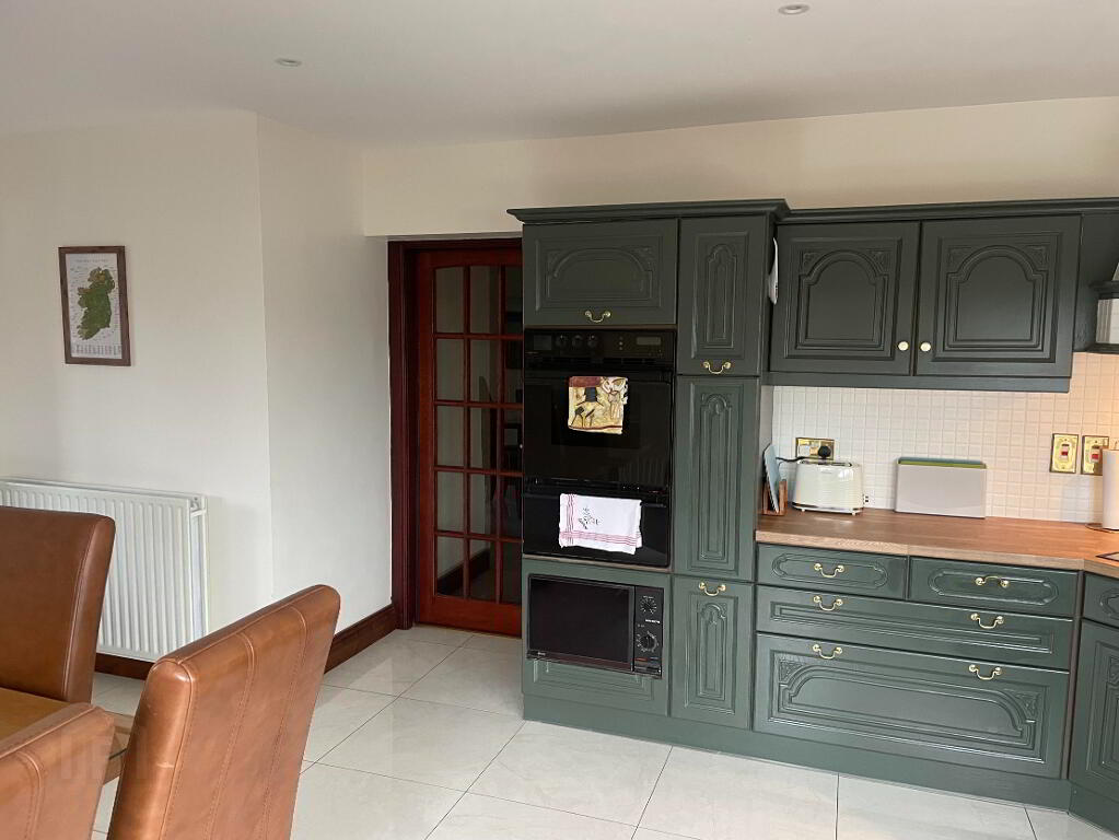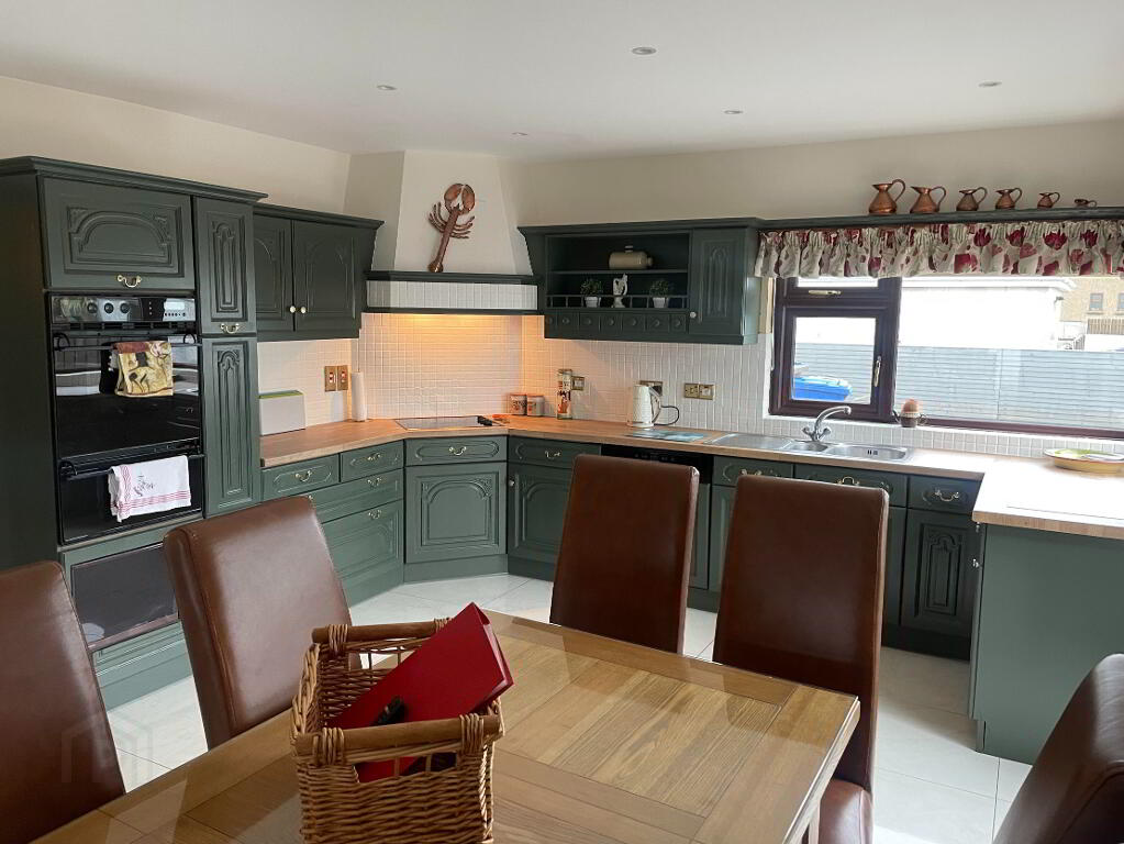 Kitchen/ Dining Area: Large open plan room with tiled flooring, high and low units, rear view aspect. Large dining table and chairs, sofa . Rear back door