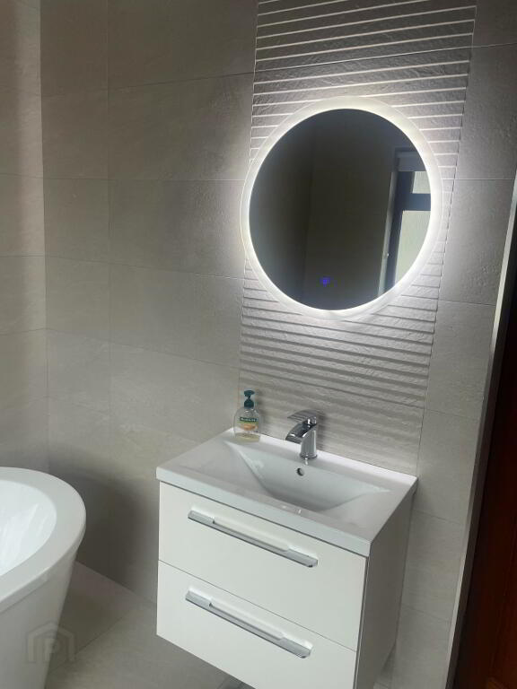 Bathroom: Modern bathroom suite with WC, Wash Hand basin with vanity under and lighted mirror over, Bath and large walk in shower. Fully tiled floors and walls.