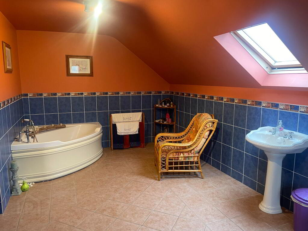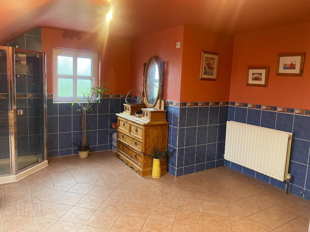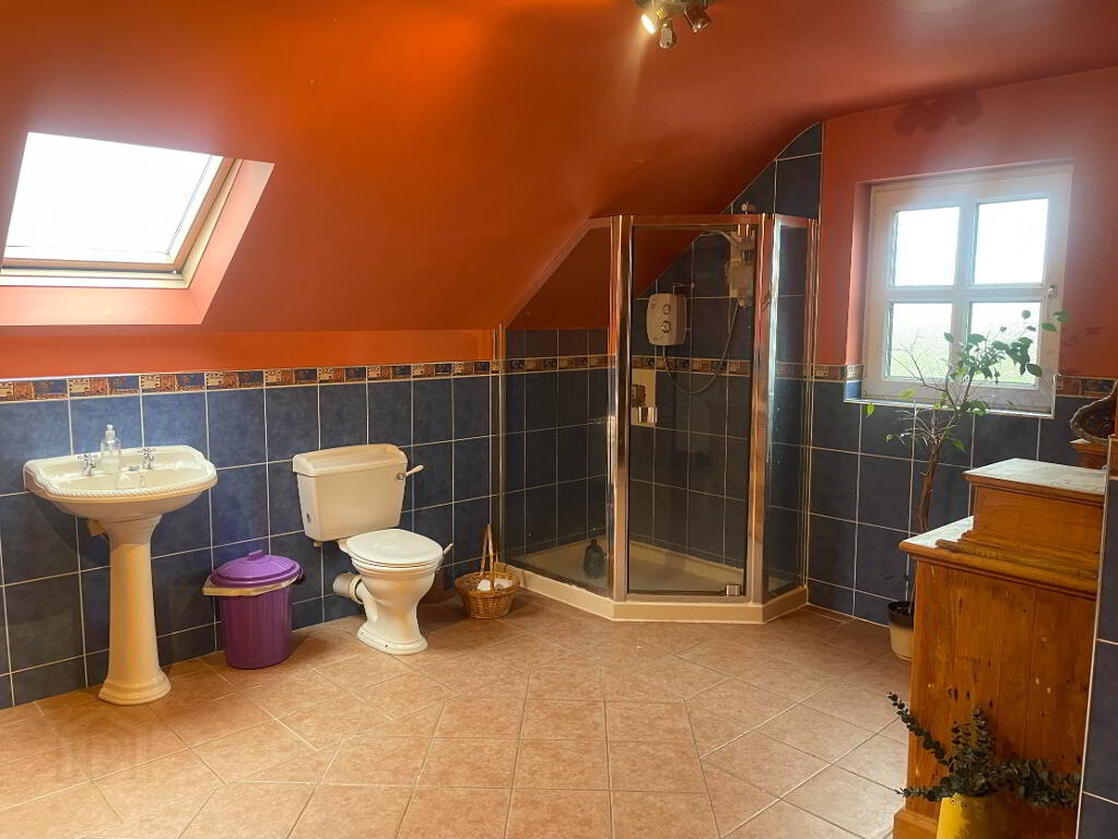 Very spacious main bathroom complete with four piece suite to include WC, Wash hand basin, shower unit with Electric 'Triton' Shower, Corner bath. Fully tiled floors and walls. Large velux window to the rear and window to side. Double Radiator. Extractor fan