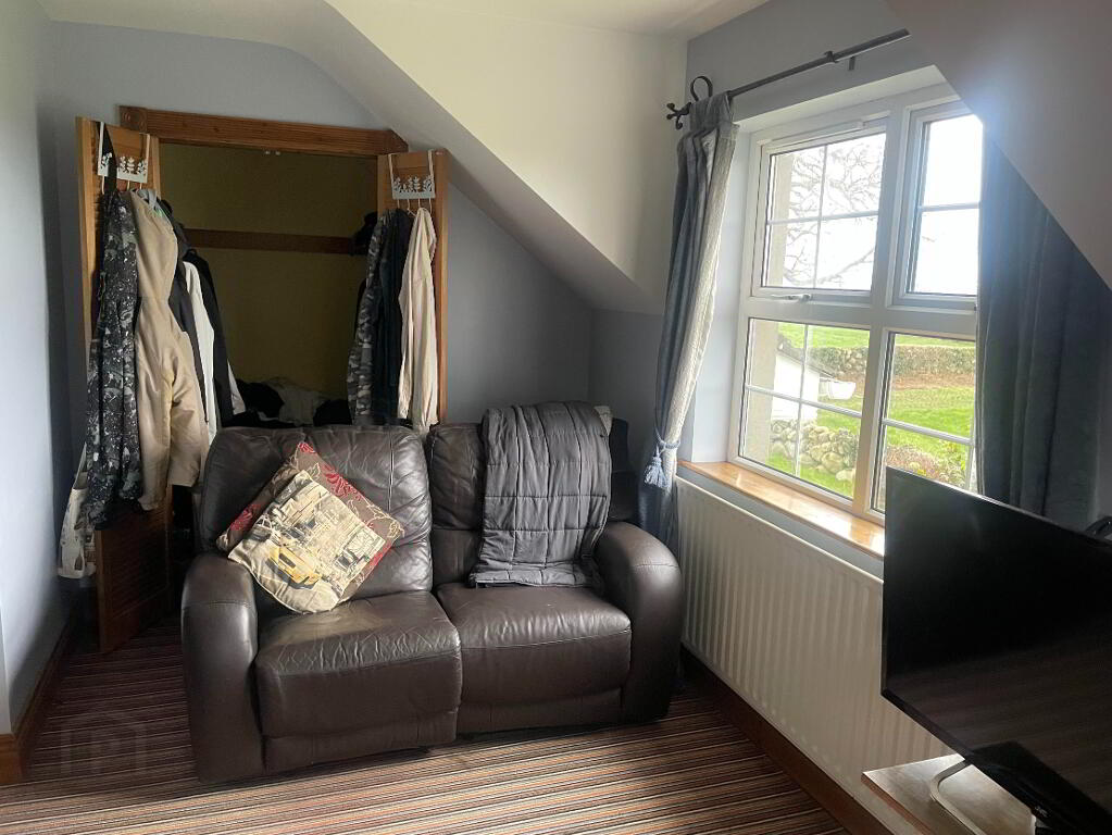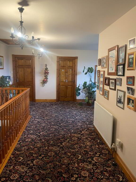 Solid Wooden stairs with carpet down the middle, large open plan upstairs hallway with carpet flooring. Two single radiators, access to roofspace, large front view window with sea views. Side walk in storage cupboard.