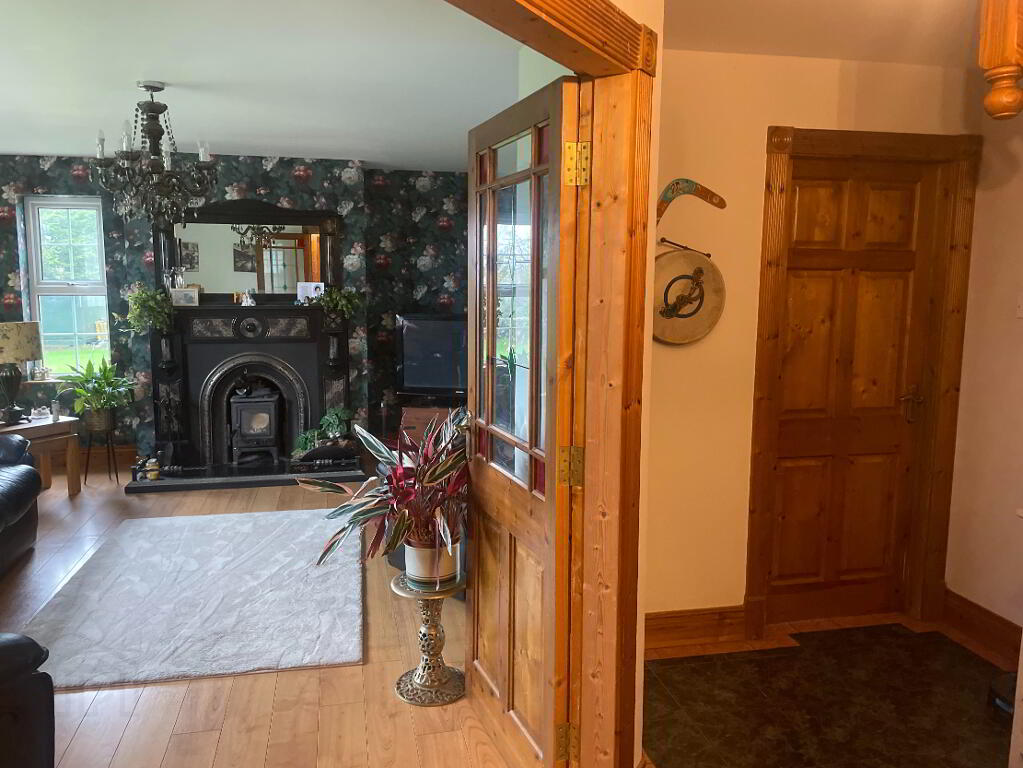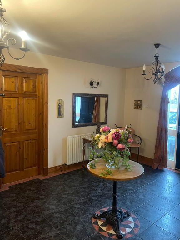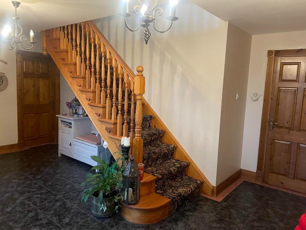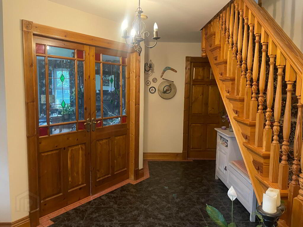 Large spacious front hallway with Solid Wooden front door with glass panel to the sides. Tiled flooring, Main centre point lighting and side wall lights. Door leading to rear back porch.