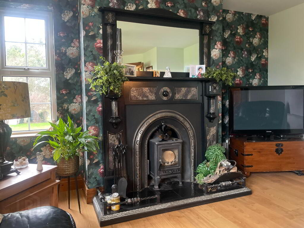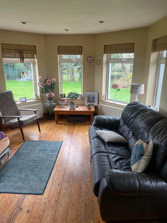 Large windows with views down to the sea, Wood Burning Stove with Black Cast Iron and wooden design surround. Black Granite hearth and mirror over. Laminated flooring. Two large single radiators. Double wooden doors with glass inset leading from hallway.