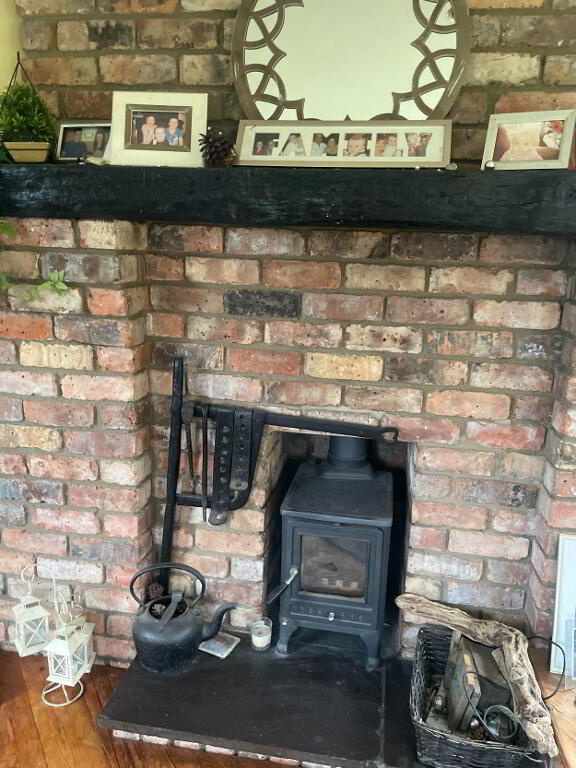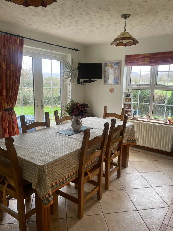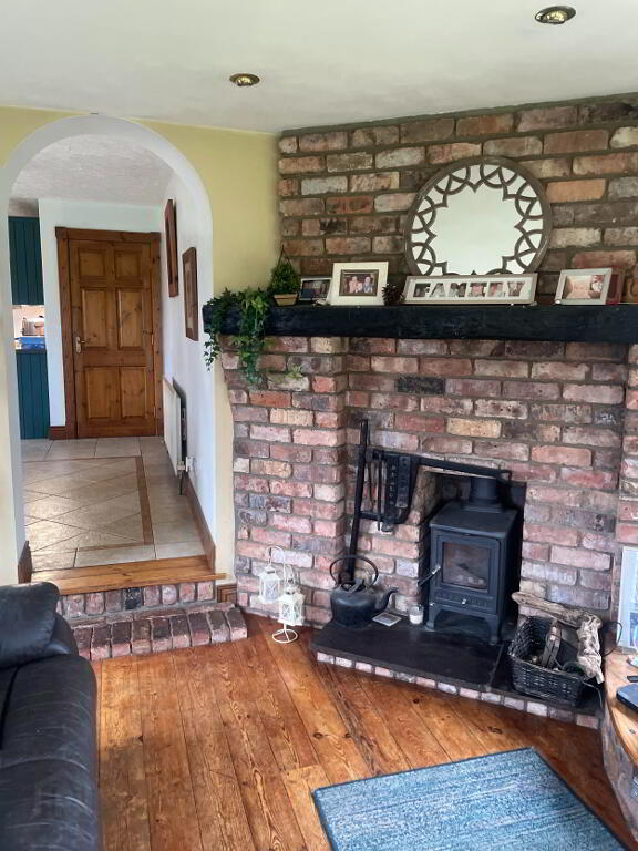 Stepped down from the Dining area, this room offer great views right round. Wood Burning Stove with Red Brick surround, and Slate hearth. Spotlighting. Solid wooden flooring. Two double radiators.