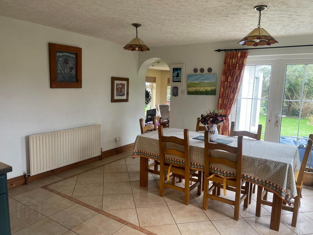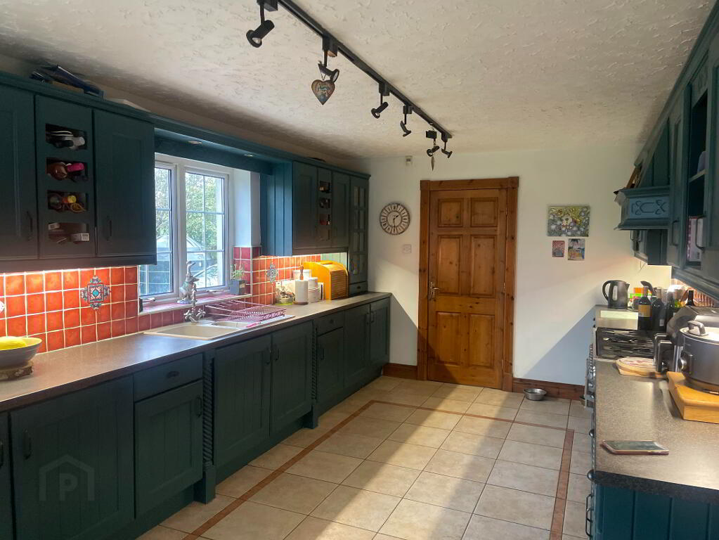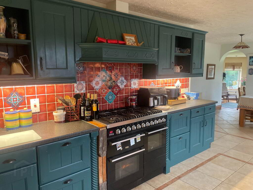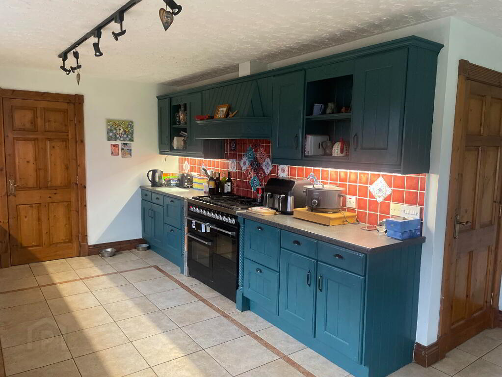 High and Low fitted wooden units, complete with display cupboards and wine racks. ILVE Oven Range with six ring Gas Hob and extractor fan over, Cream sink & side drainer with a window over looking the Mountains - You wouldn't complain doing the dishes here! Tiled flooring and partially tiled walls. Single and Double Radiators, Double French PVC Patio doors leading outside to entertaining area.