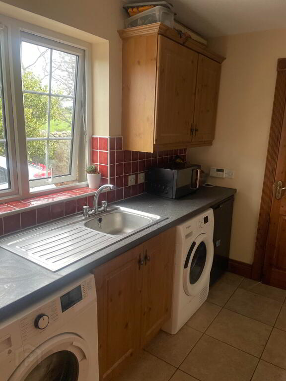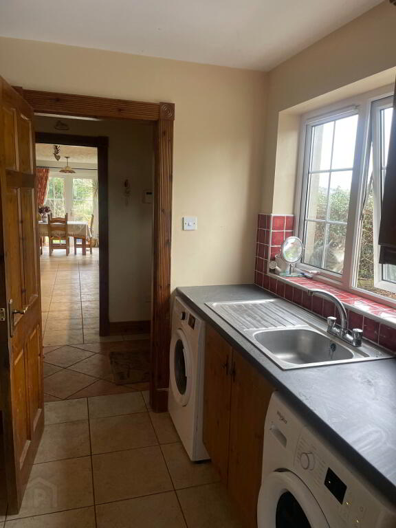 High and Low fitted wooden unit, Stainless Steel Sink with side drainer, plumbing for washing machine and tumble dryer, Tiled flooring, leading into