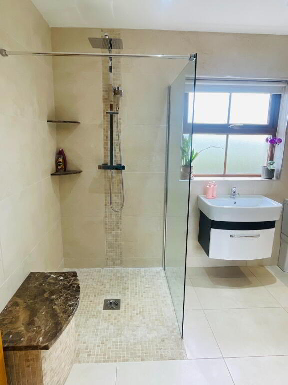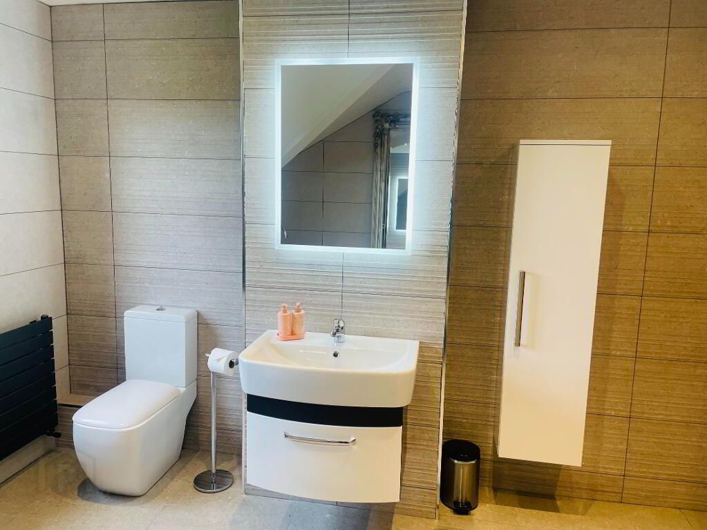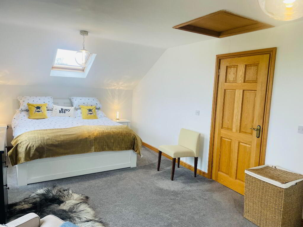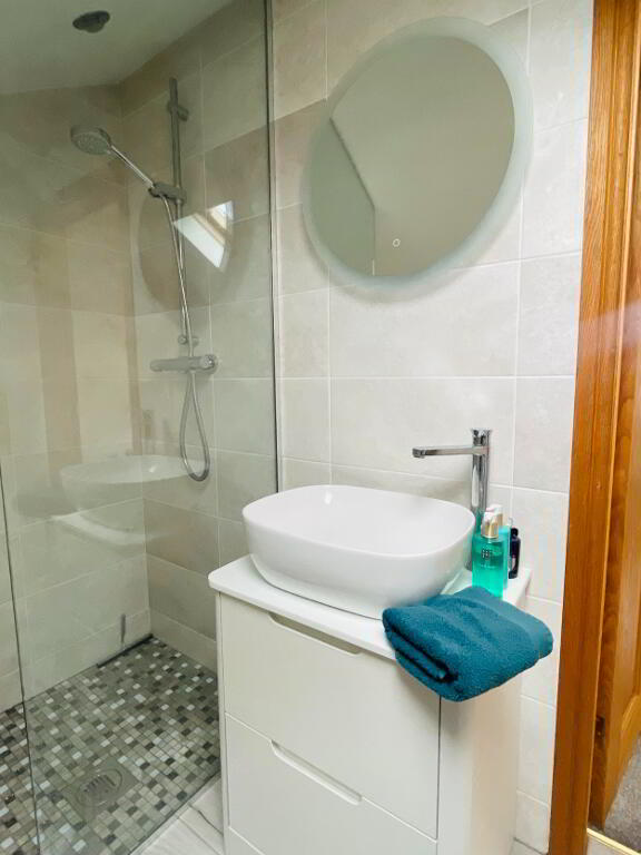This elegant chic, retreat like Bathroom comes complete with fully tiled flooring and walls, Double walk in shower with Rainfall head and separate shower head, Dual flush WC and Wash hand basin with vanity drawers under. Free standing bath with Mixer taps and shower head hose. The view out this window offers charming countryside views. Large grey radiator and chrome towel radiator. Spotlighting, heated LED Mirror, Extractor fan.