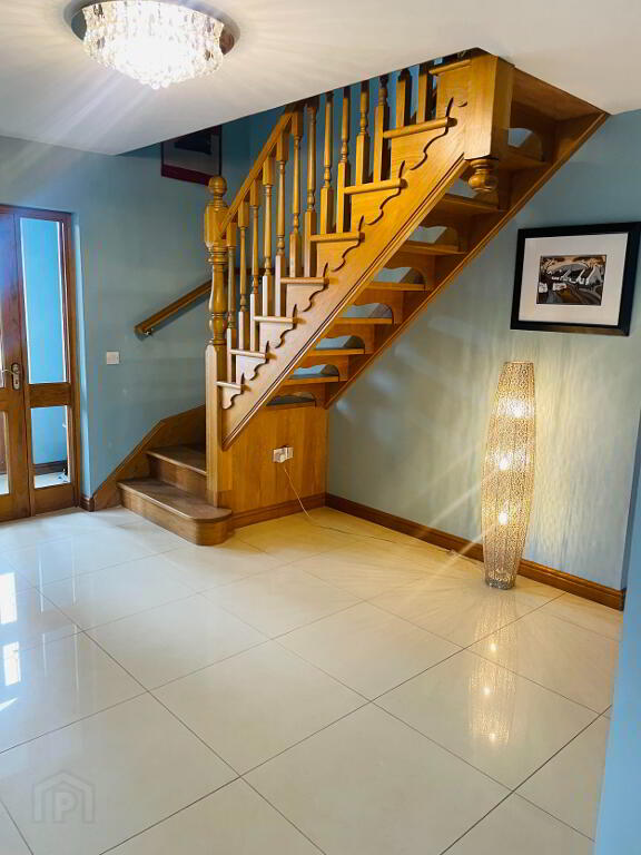 Inviting hallway with porcelain tiled flooring with underfloor heating. Thermostat control. Well crafted Solid Oak Staircase with electrical sockets under.