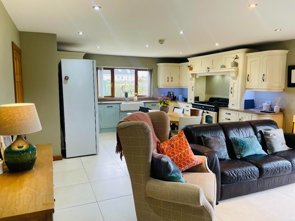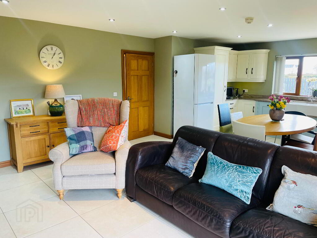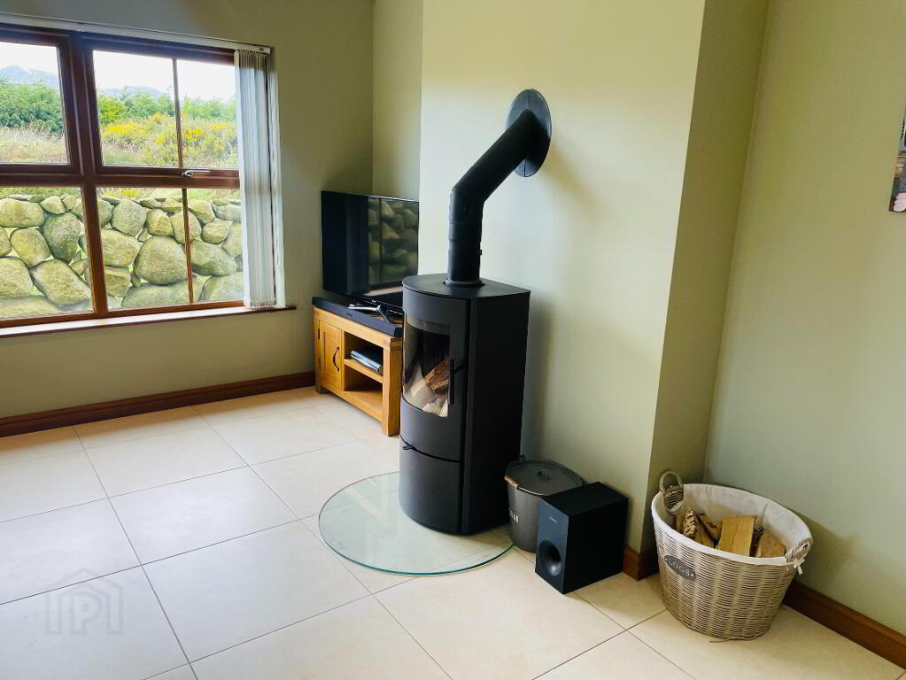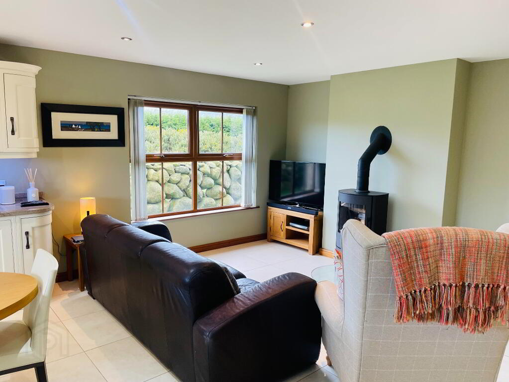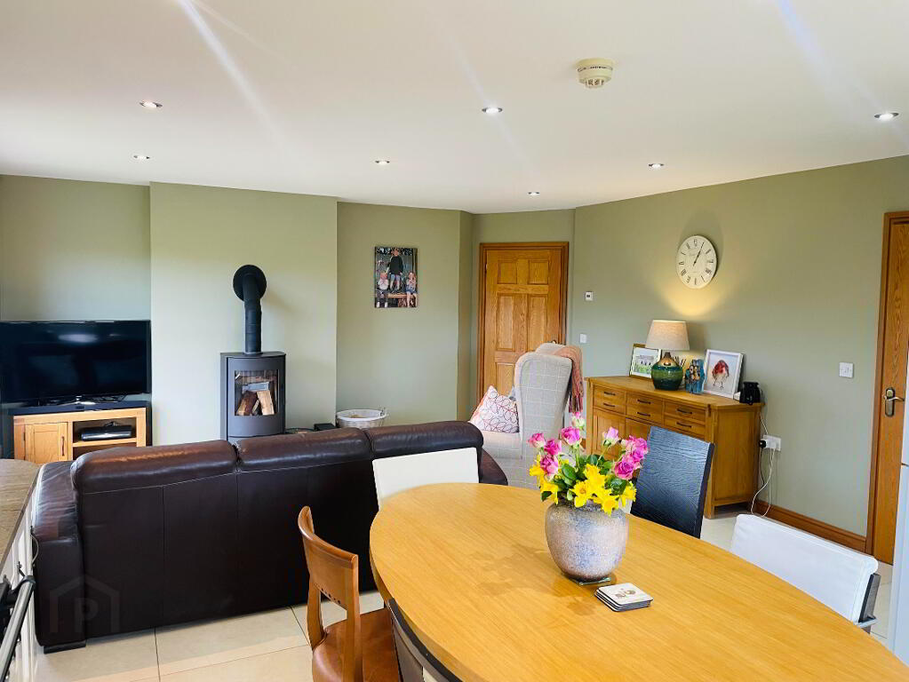 Reception Area: Continuing on from the Kitchen, 'Romotop Laredo' Wood Burning Stove on Glass panel, Tiled flooring with underfloor heating, Thermostat control. Spotlights. Views into the Mourne Mountains.