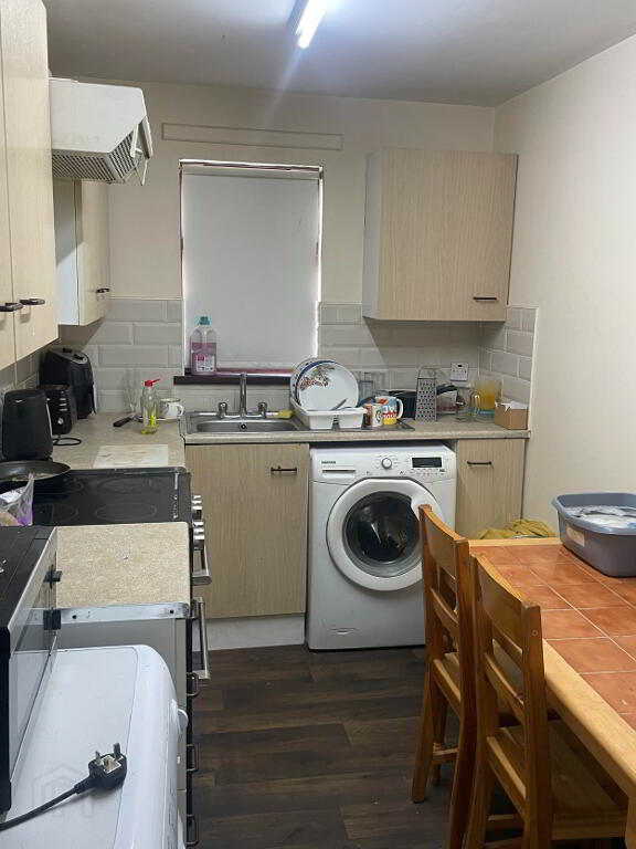 High and Low fitted units with worktop, tiled under high units, Stainless Steel Sink and side drainer, Plumbing for washing machine, Tiled flooring, Rear PVC Back Door