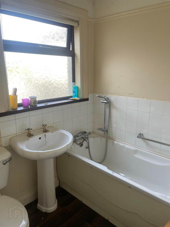 Three piece white suite to include WC, Wash hand basin and Bath with shower over. Tiled splash back at sink and around shower / bath area. Extractor fan.