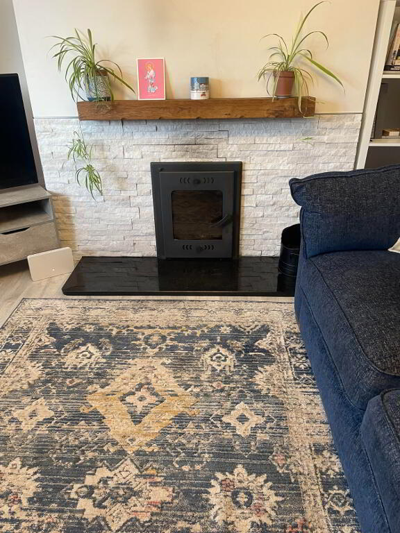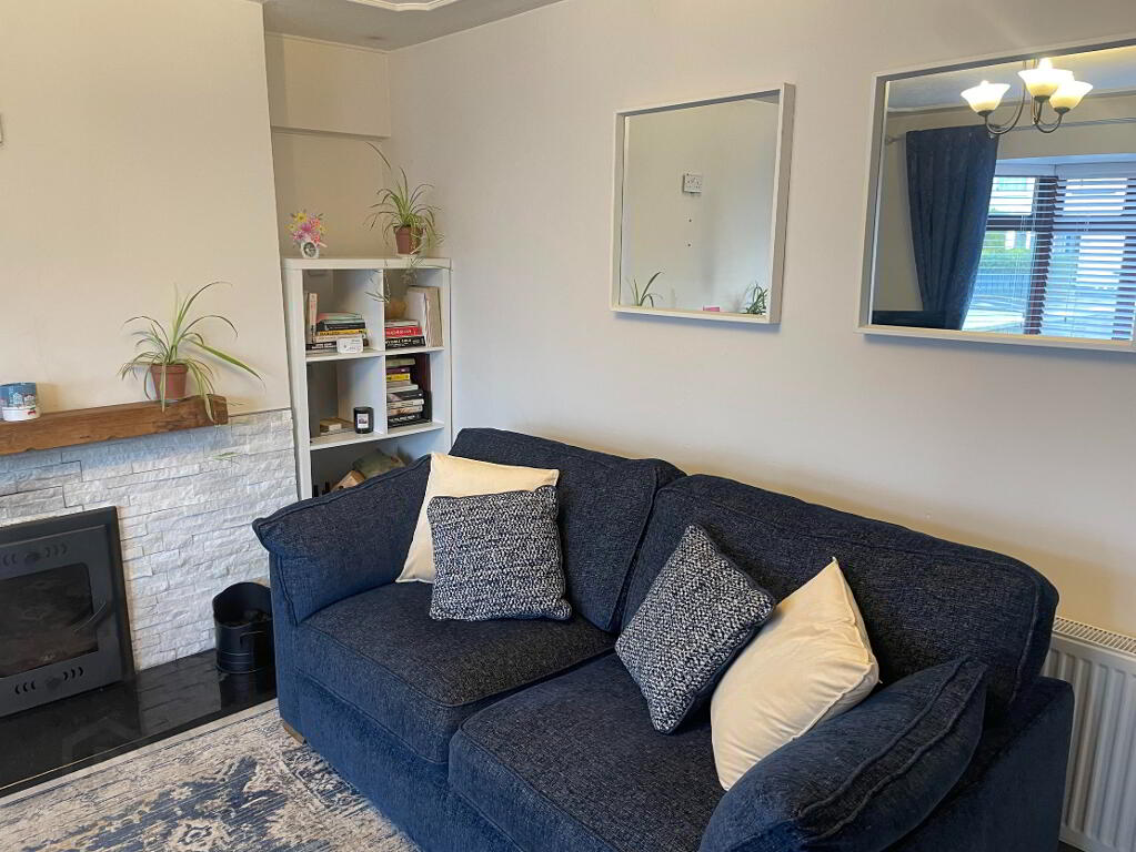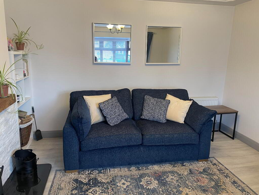 Grey laminated flooring, large bay window to the front of property, Beautifully appointed tiled fireplace surround with Solid Wooden Beam over, Open fire with the excellent advantage of a Back Boiler and door over fire. USB Plug sockets. Double Radiator and coving to ceiling.