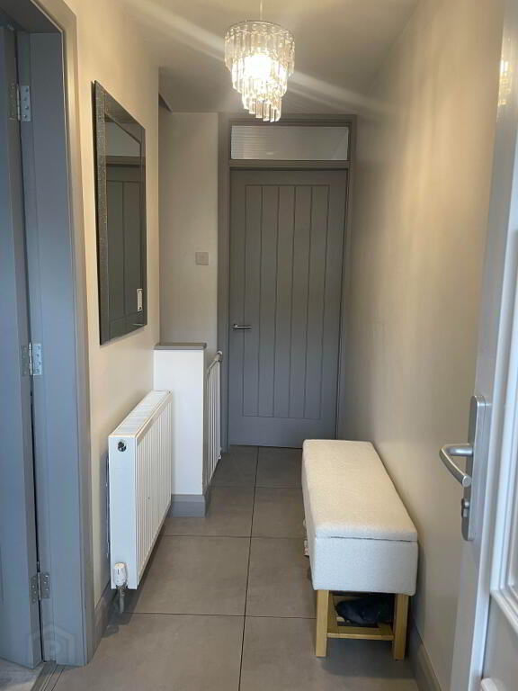 PVC White front door with glass inset, which has been stepped back into the property to provide a sheltered porch area, Tiled flooring, Double Radiator