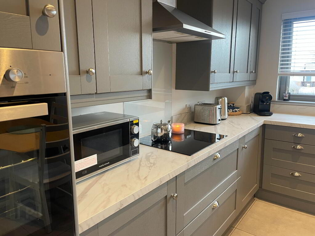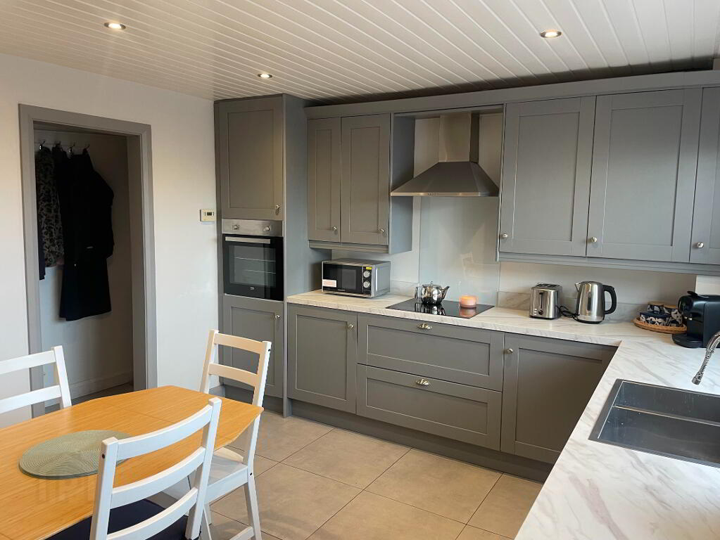 Stunning New Grey Kitchen with high and low fitted units, with stainless steel sink and mixer hose like tap, integrated mid level Beko oven and Beko Touch Hob with Stainless Steel Extractor Fan over, integrated dishwasher, Spotlight and Double Radiator.