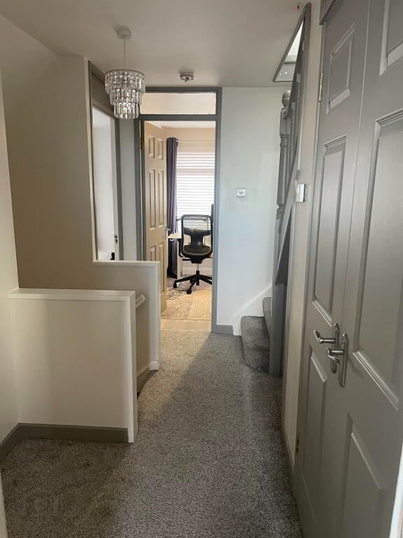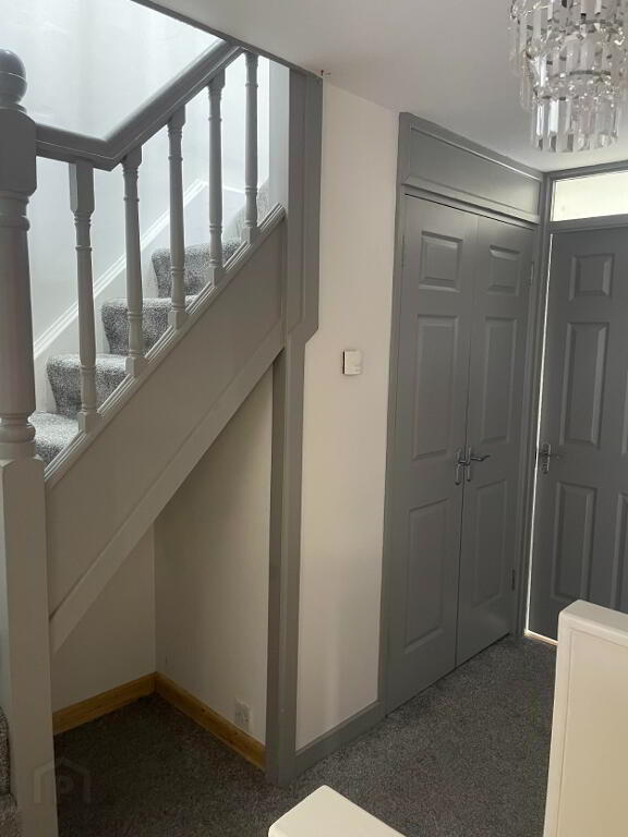 Staircase: Staircase and Landing grey carpet, double door hotpress with ample shelving and second set of stairs leading to storage area on second floor. Thermostat control panel.