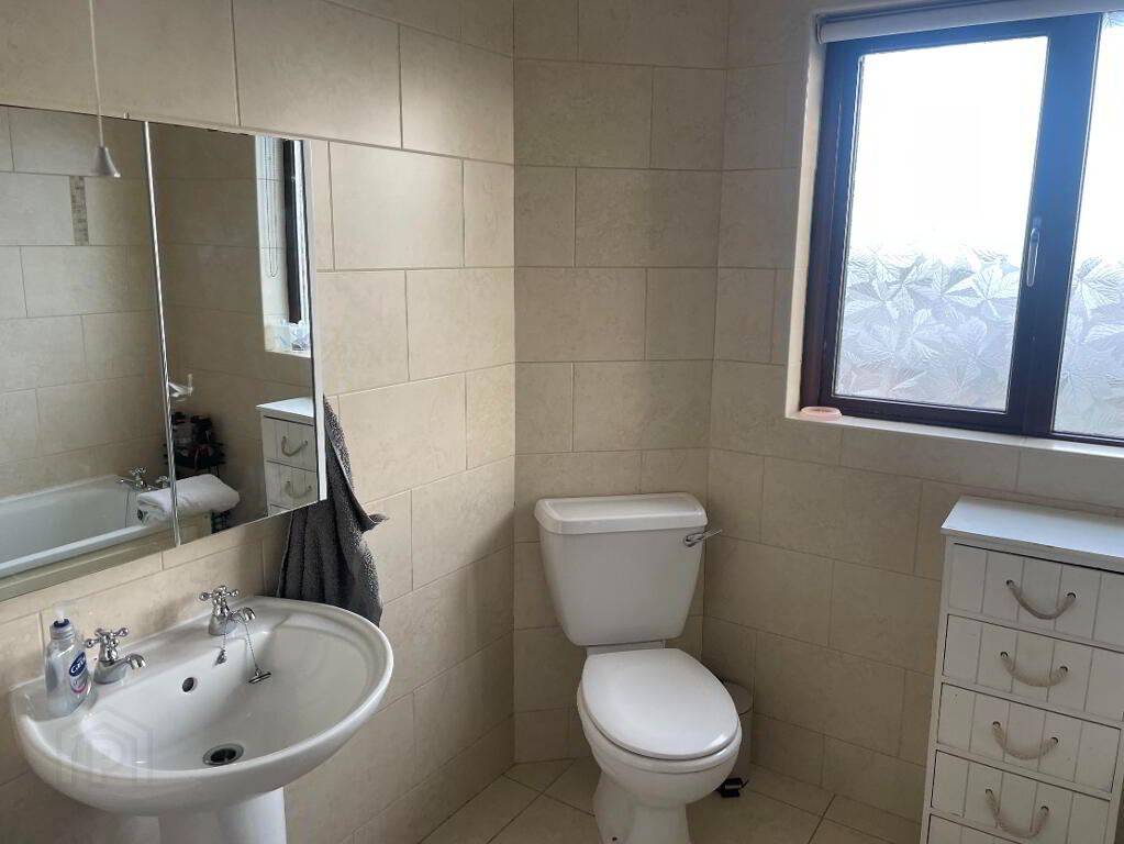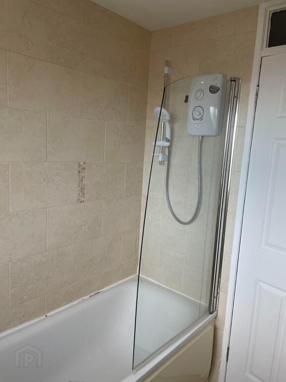 Three piece white suite to include WC, Wash hand basin with double door mirror vanity unit over. Bath with Electric 'Mira' Electric Shower over. Fully tiled floors and walls.