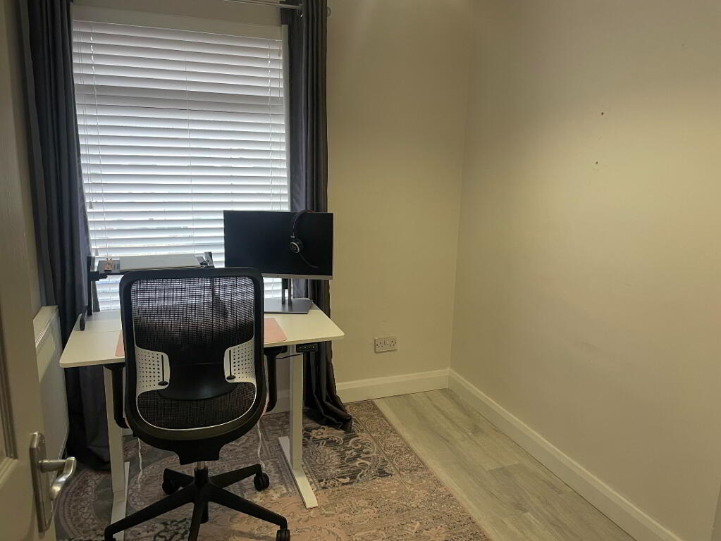 Rear view aspect, grey laminated flooring with built in storage cupboard and Double Radiator